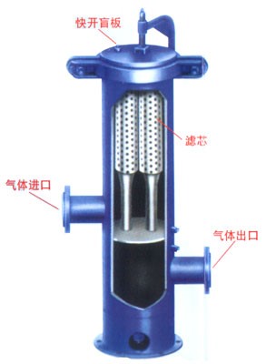 干氣過濾器是一種濾芯式過濾器,內部由多支濾芯組成,過濾的原氣由入口通過導流管或者旋風管,將氣體中含有的固體顆粒及油霧碰撞落入容器底部,通過導管進入分離器底部積液包,可通過觀察視鏡窗口外排。然后從濾芯外表面進入濾芯內部進行精度高分離,潔凈后的氣體導入絲網除沫器,經過三級過濾導出。